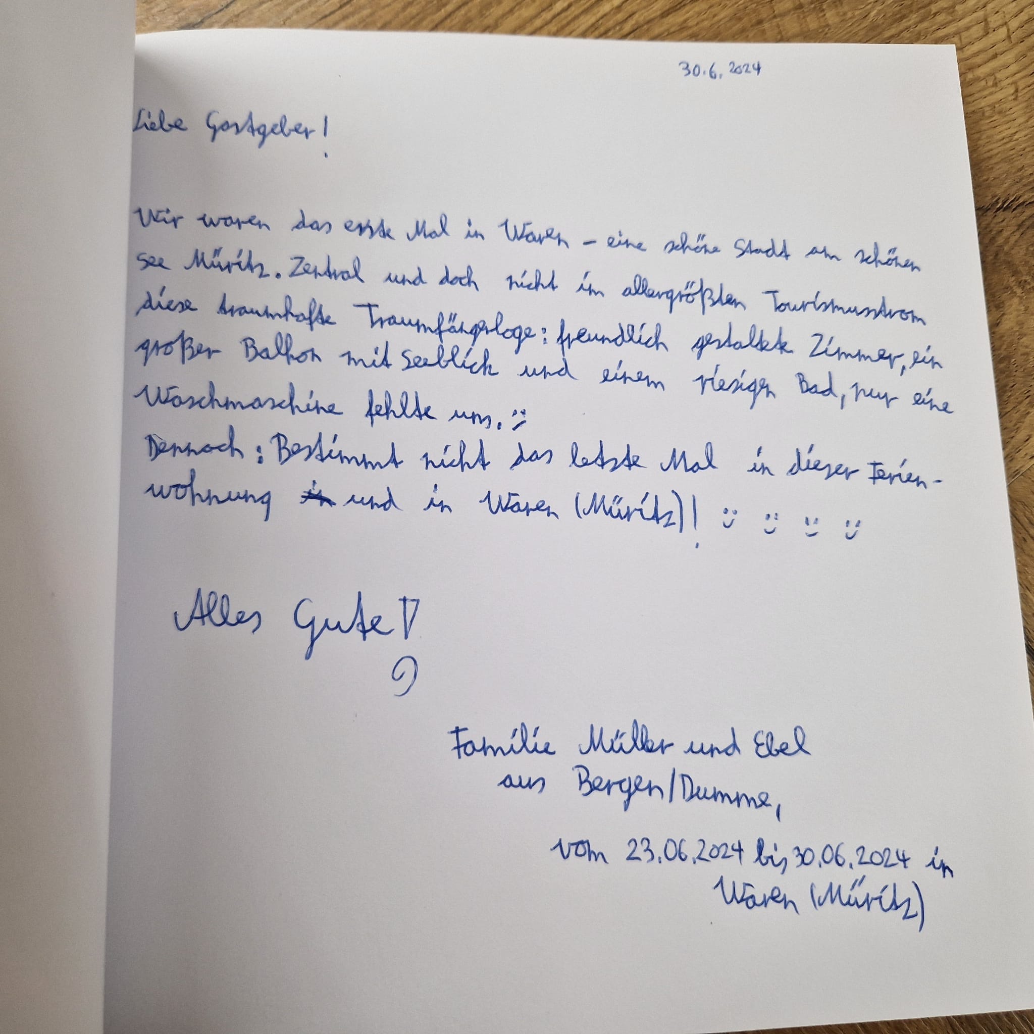 Liebe Familie Haake/Göttinger sind Sie jederzeit wieder bei uns in Waren willkommen! Vielen Dank für diesen tollen Gästebucheintrag.